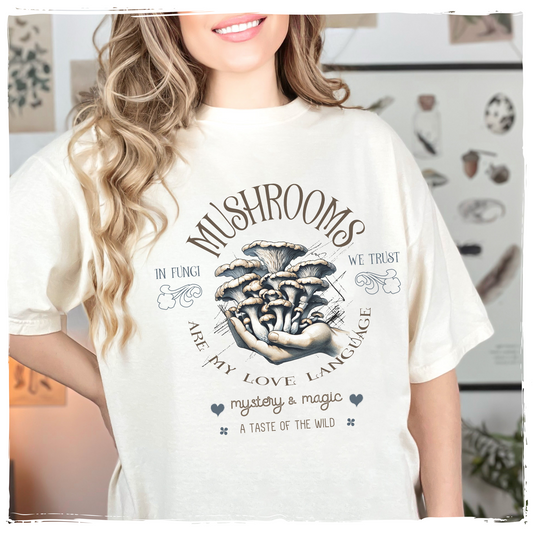 Mushrooms are My Love Language Vegan Tee Shirt in Light Colors {Unisex}
