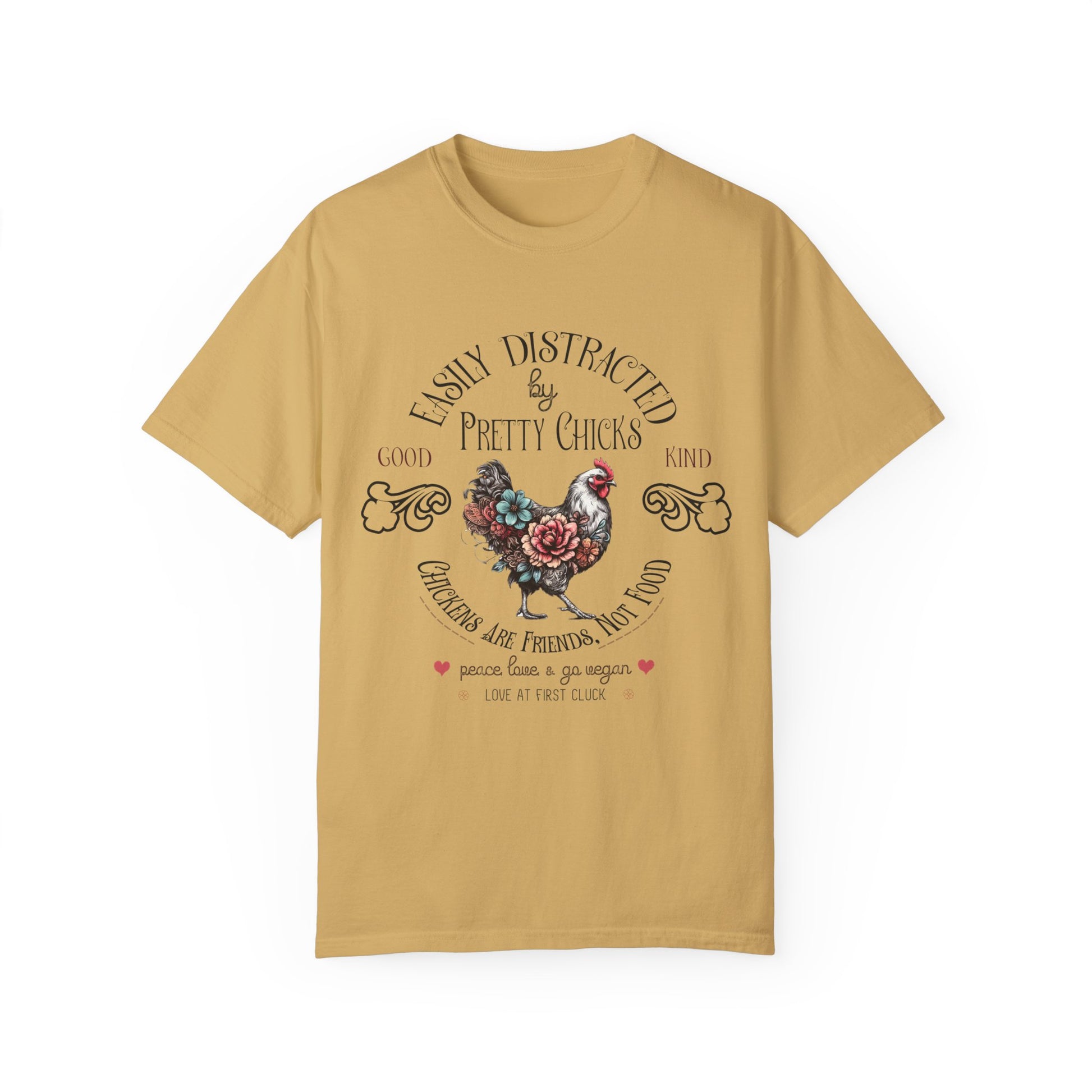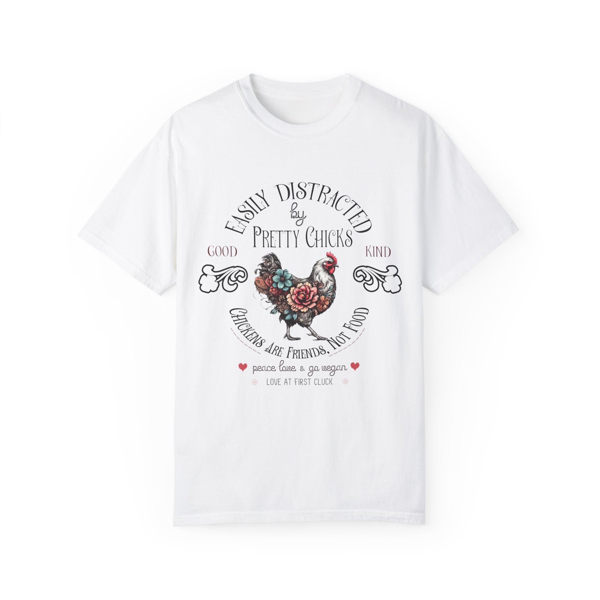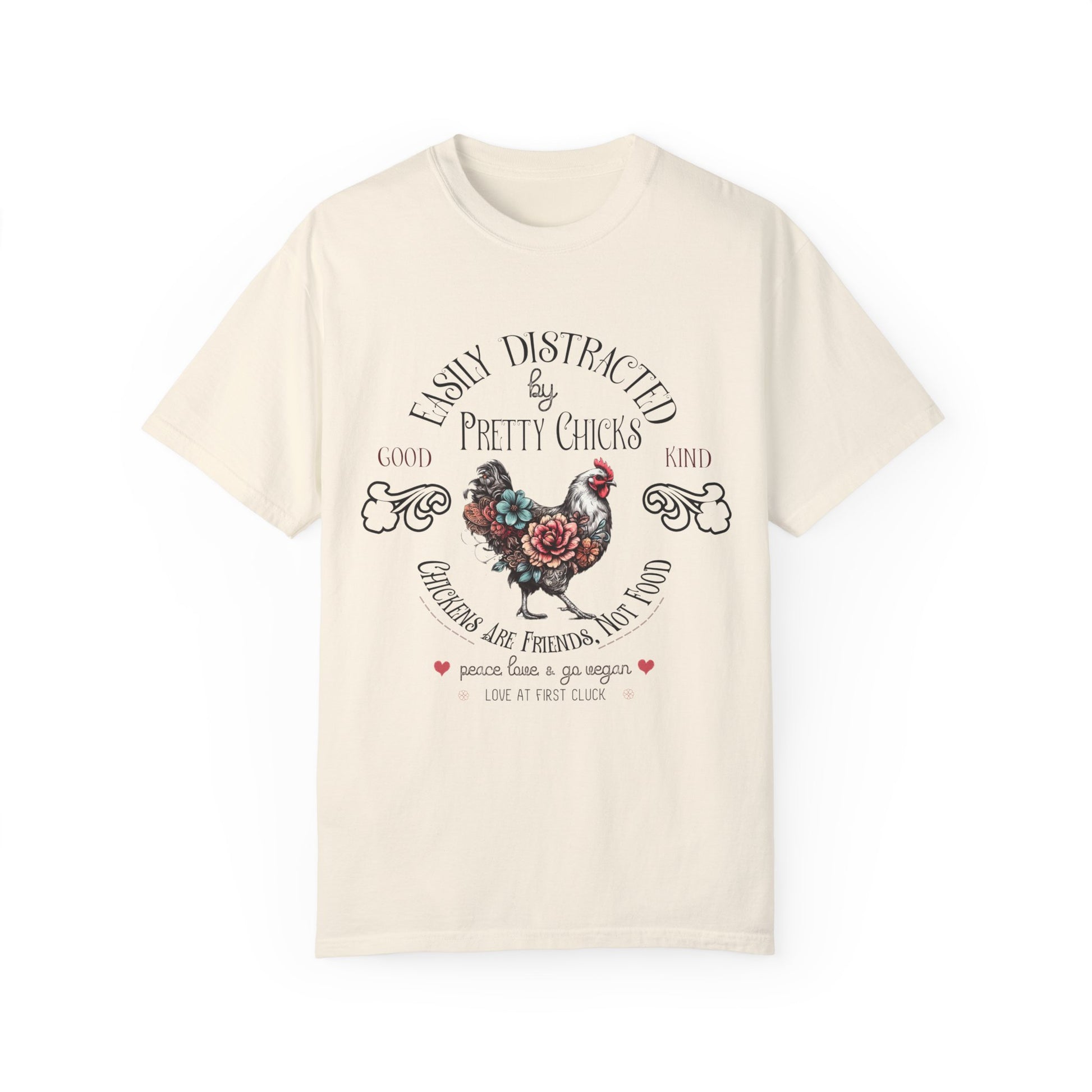 Let your whimsical side shine with the "Easily Distracted by Pretty Chicks" tee from Cute Vegan Tees. This charming shirt features a beautifully illustrated chicken alongside elegant vintage typography, blending a touch of rustic flair with modern design. Made with eco-friendly practices, this vegan-friendly tee is perfect for those who adore our feathered friends and support a compassionate lifestyle. Soft, comfortable, and durable, it's ideal for casual outings or as a meaningful gift to spread awareness and love for all animals.