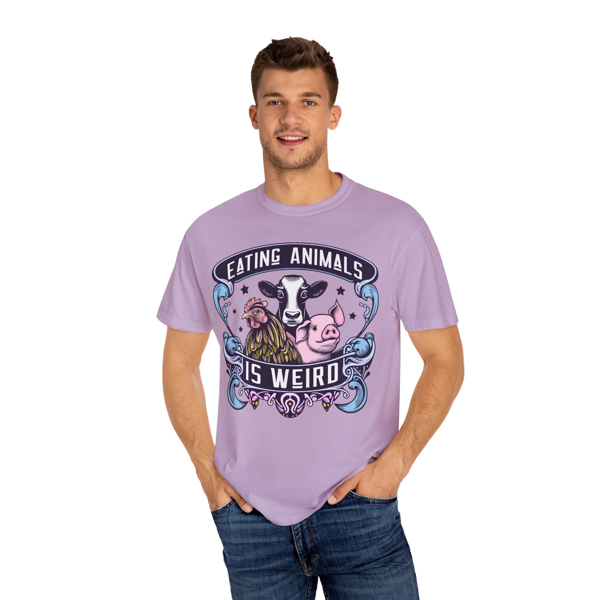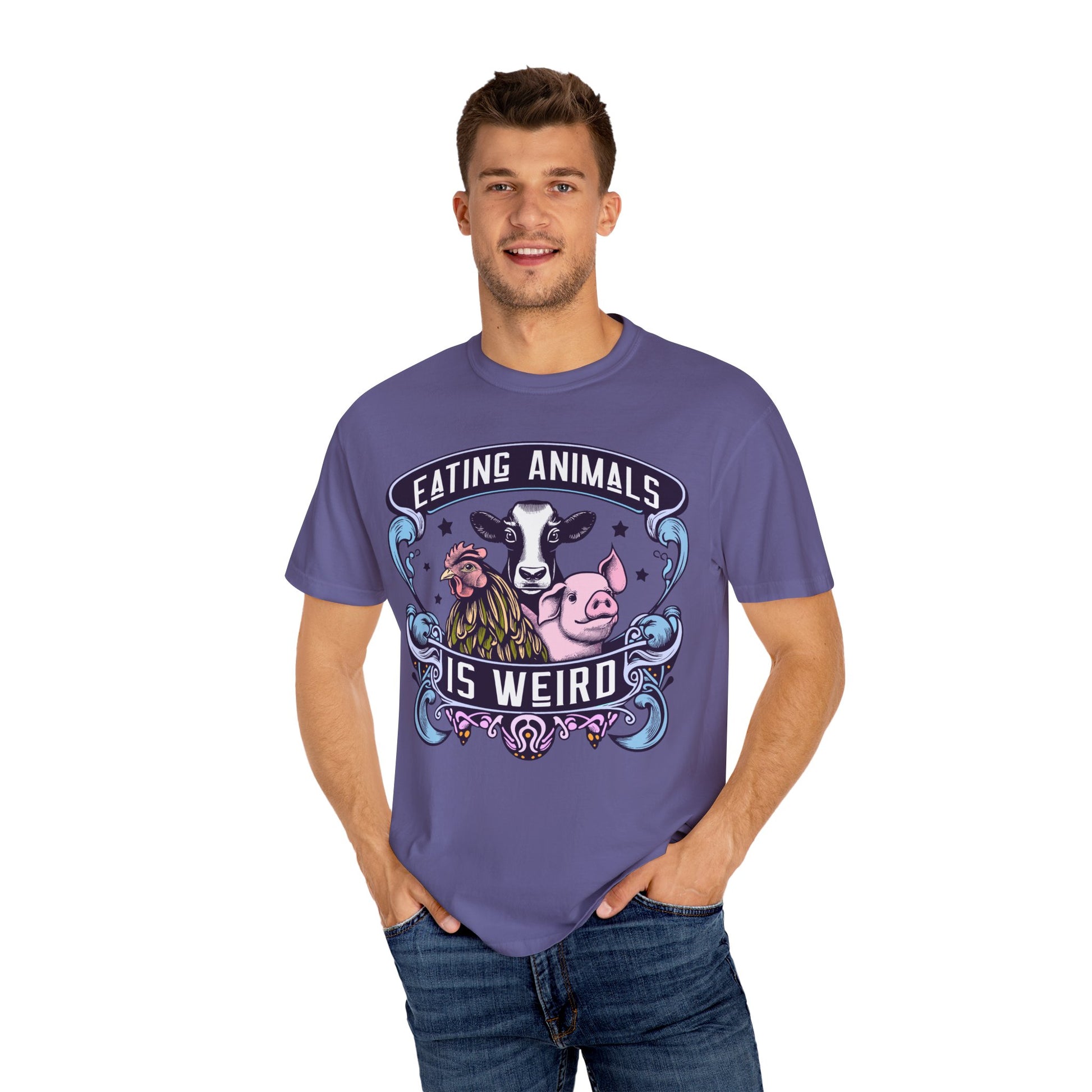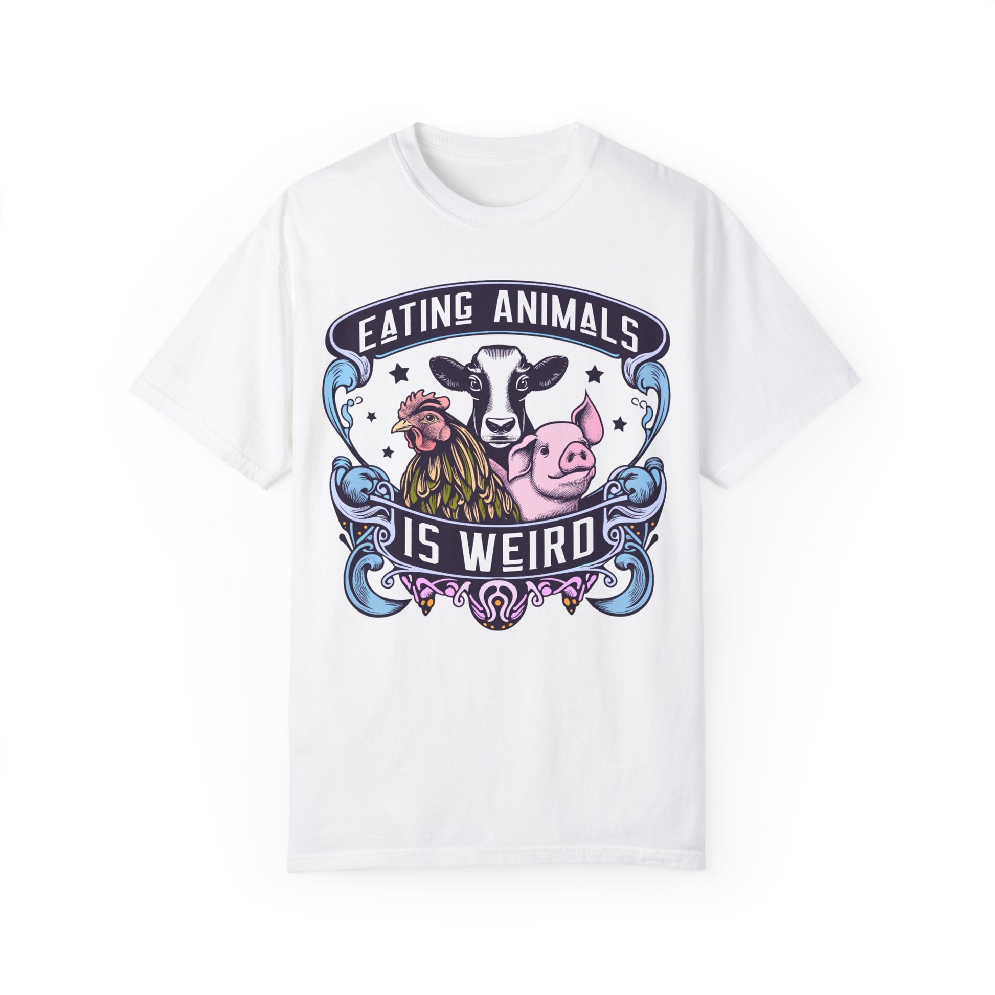 How do you like our vibrant "Eating Animals is Weird" vegan tee? This shirt boldly showcases your stance with eye-catching colors in crisp white and blues. Made for comfort and style, it's perfect for spreading a message of compassion. Whether you're advocating for animal rights or simply love a statement piece, this tee is for you. Wear it proudly and spark conversations wherever you go! Shop now for a unique addition to your wardrobe and join the movement towards a more ethical lifestyle.