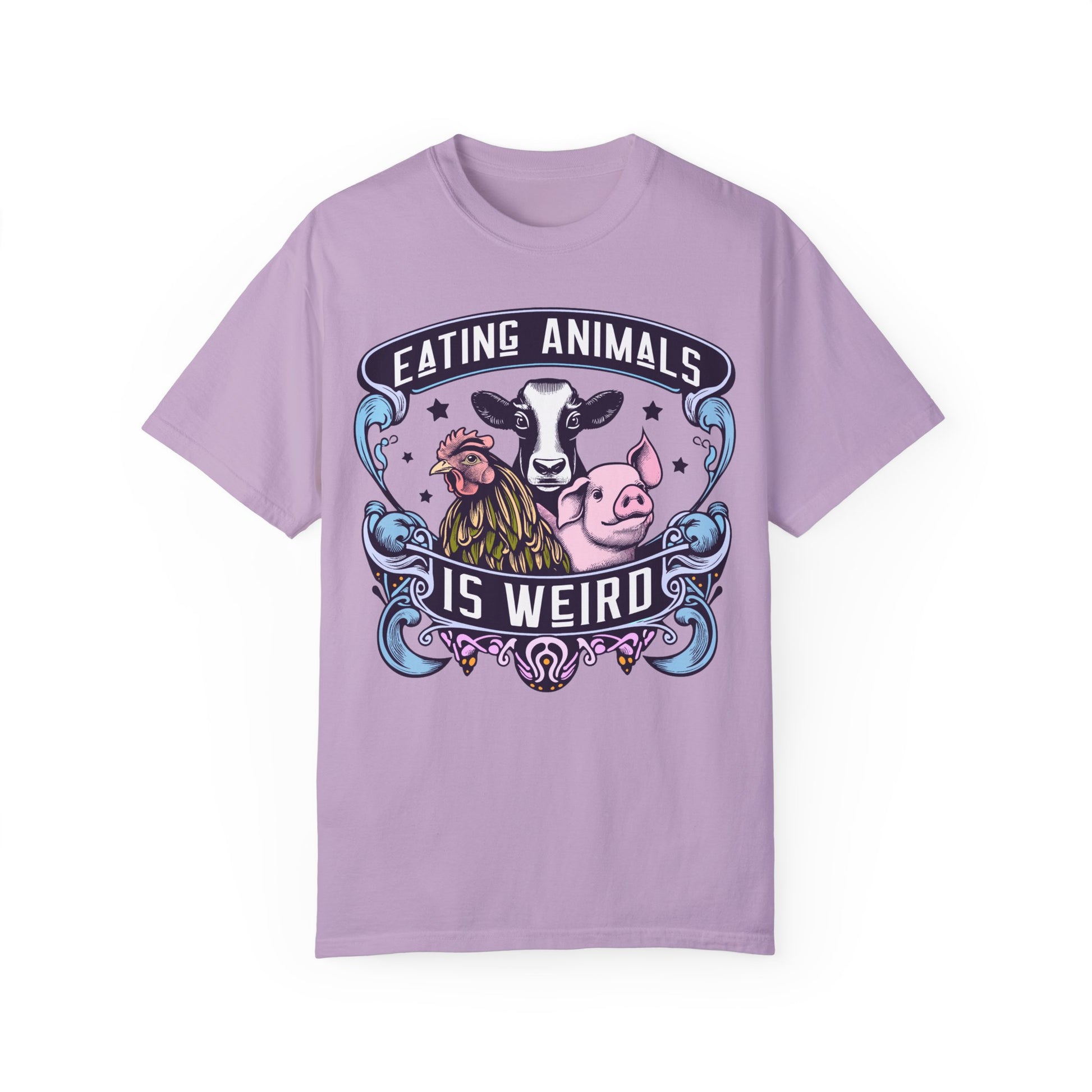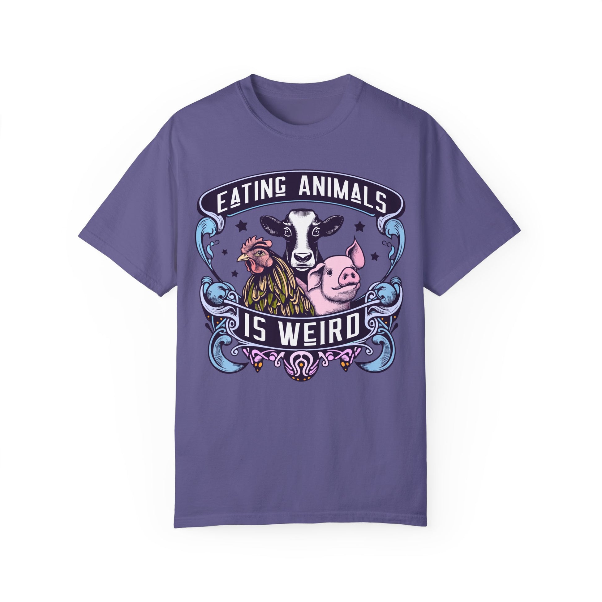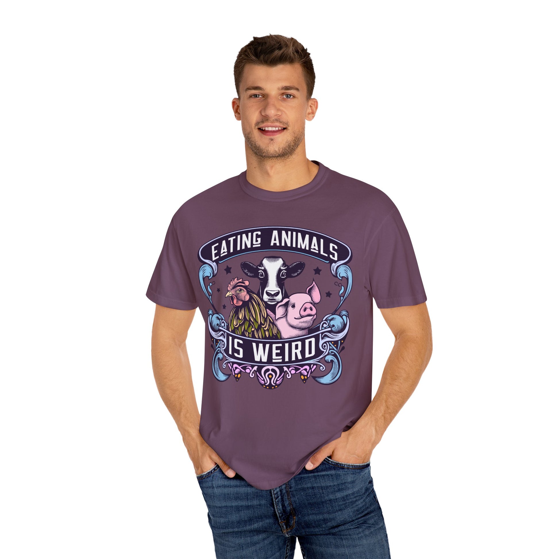How do you like our vibrant "Eating Animals is Weird" vegan tee? This shirt boldly showcases your stance with eye-catching colors in crisp white and blues. Made for comfort and style, it's perfect for spreading a message of compassion. Whether you're advocating for animal rights or simply love a statement piece, this tee is for you. Wear it proudly and spark conversations wherever you go! Shop now for a unique addition to your wardrobe and join the movement towards a more ethical lifestyle.