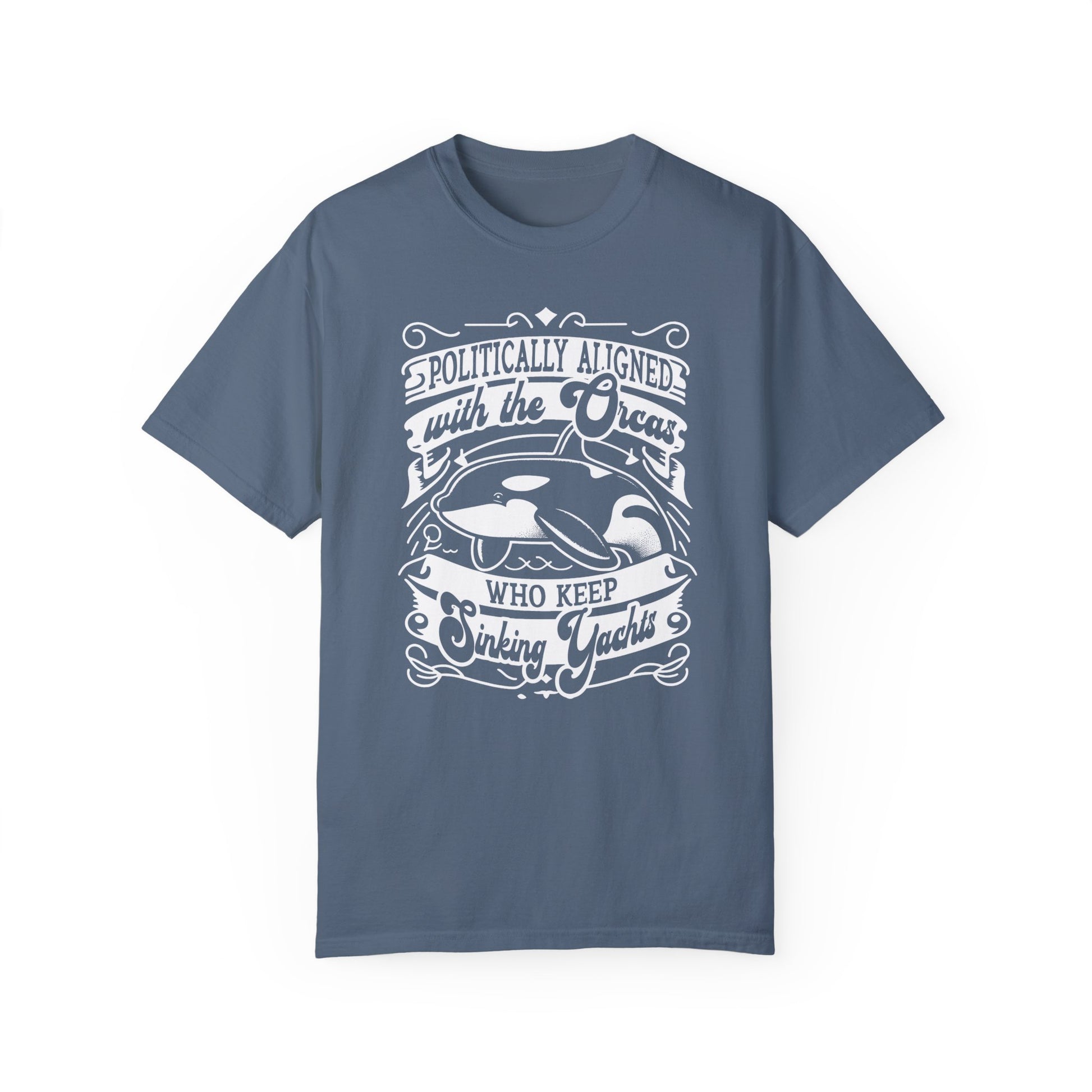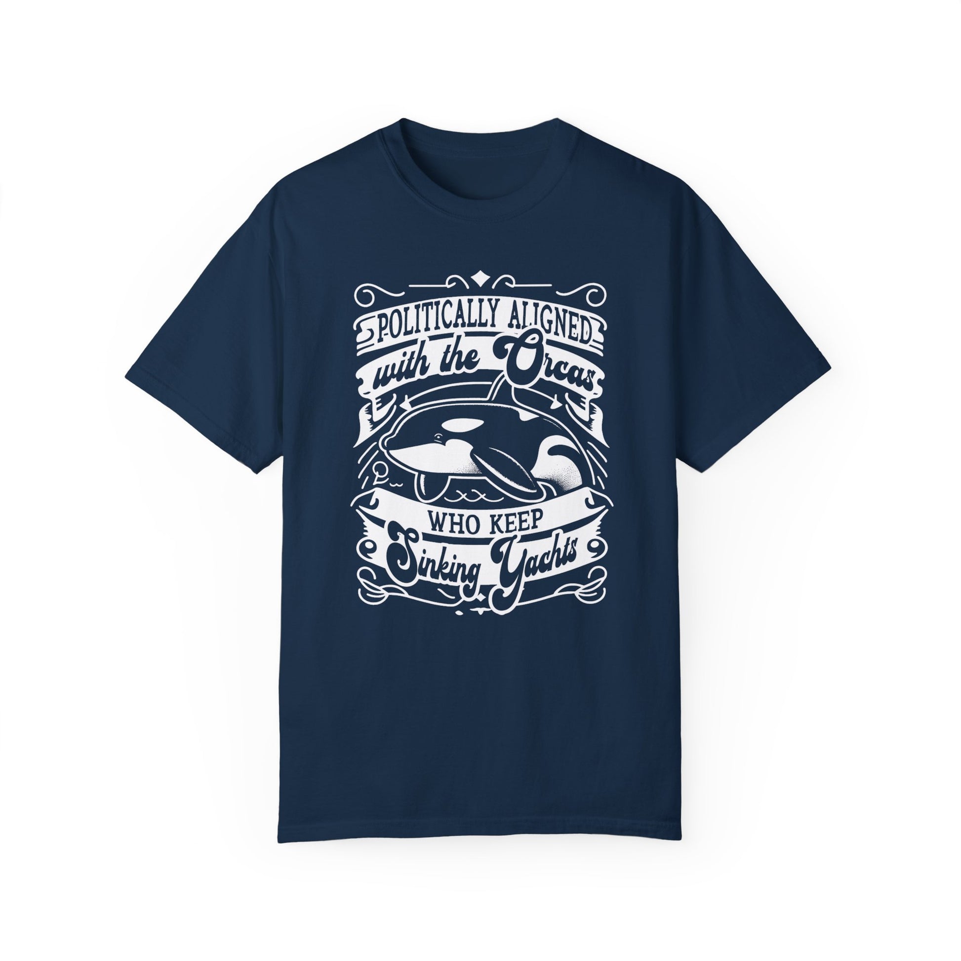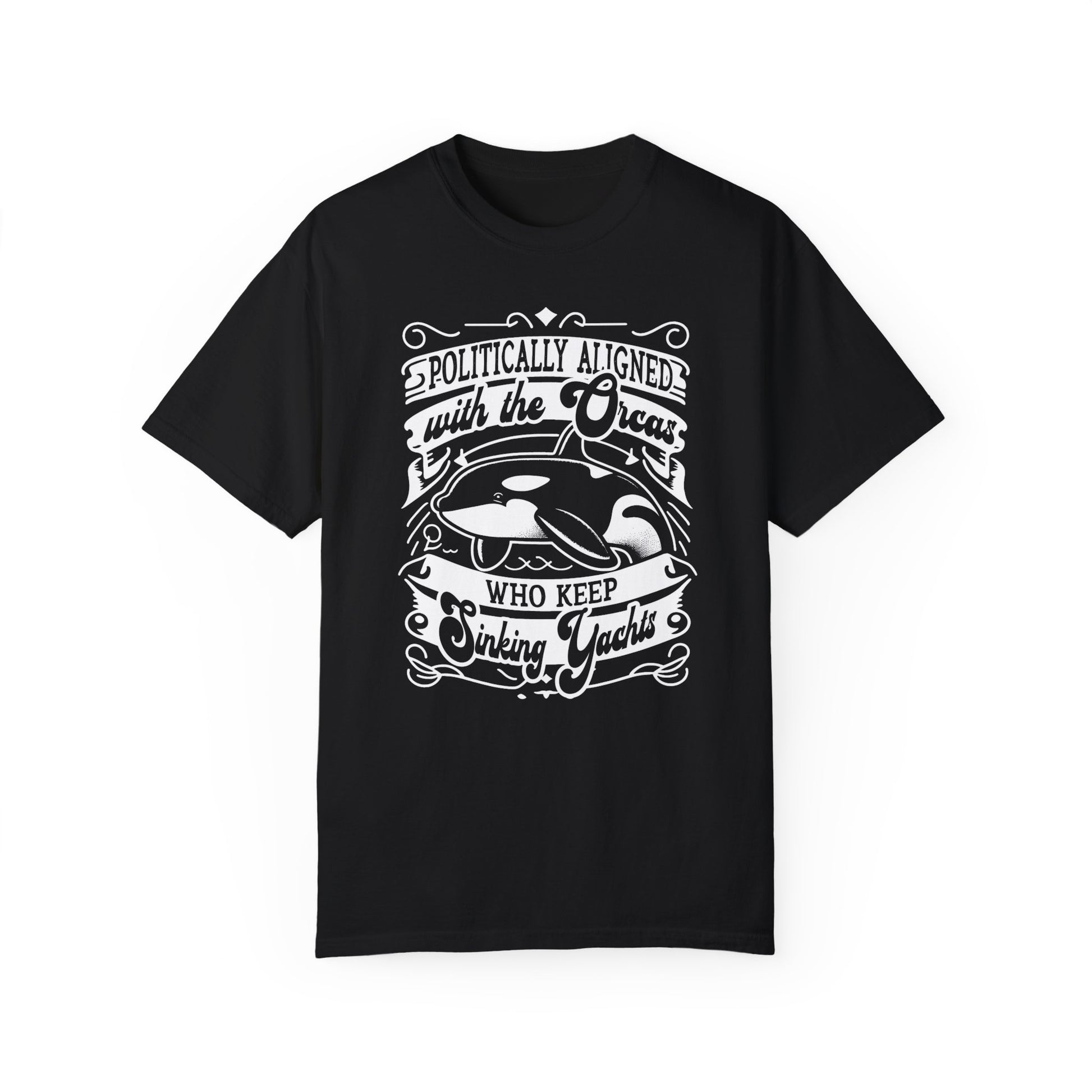 Politically Aligned with the Orcas that Keep Sinking Yachts Vegan Tee Shirt | Statement T-Shirt | Sustainable Fashion