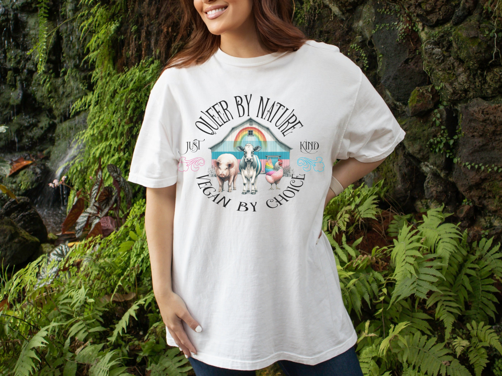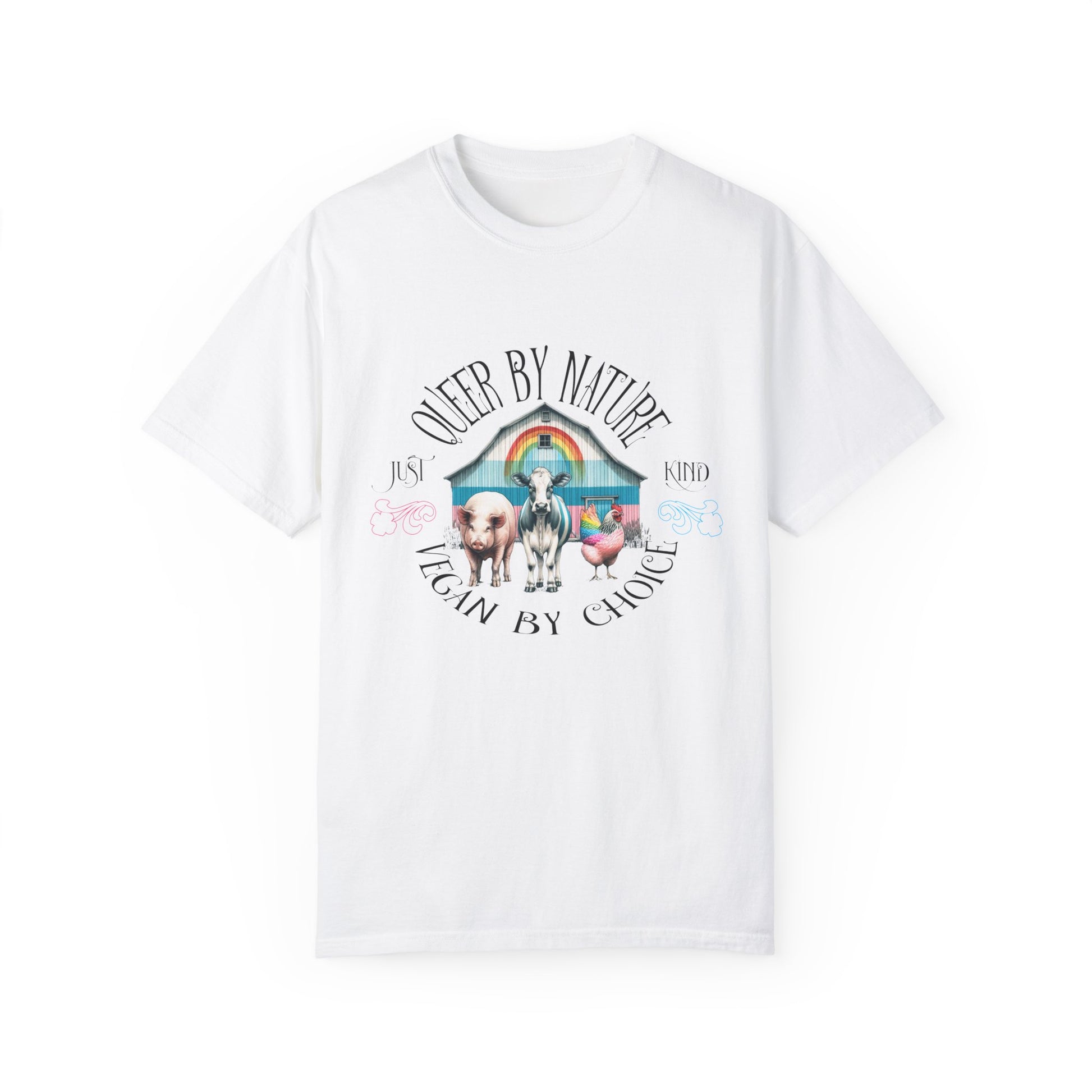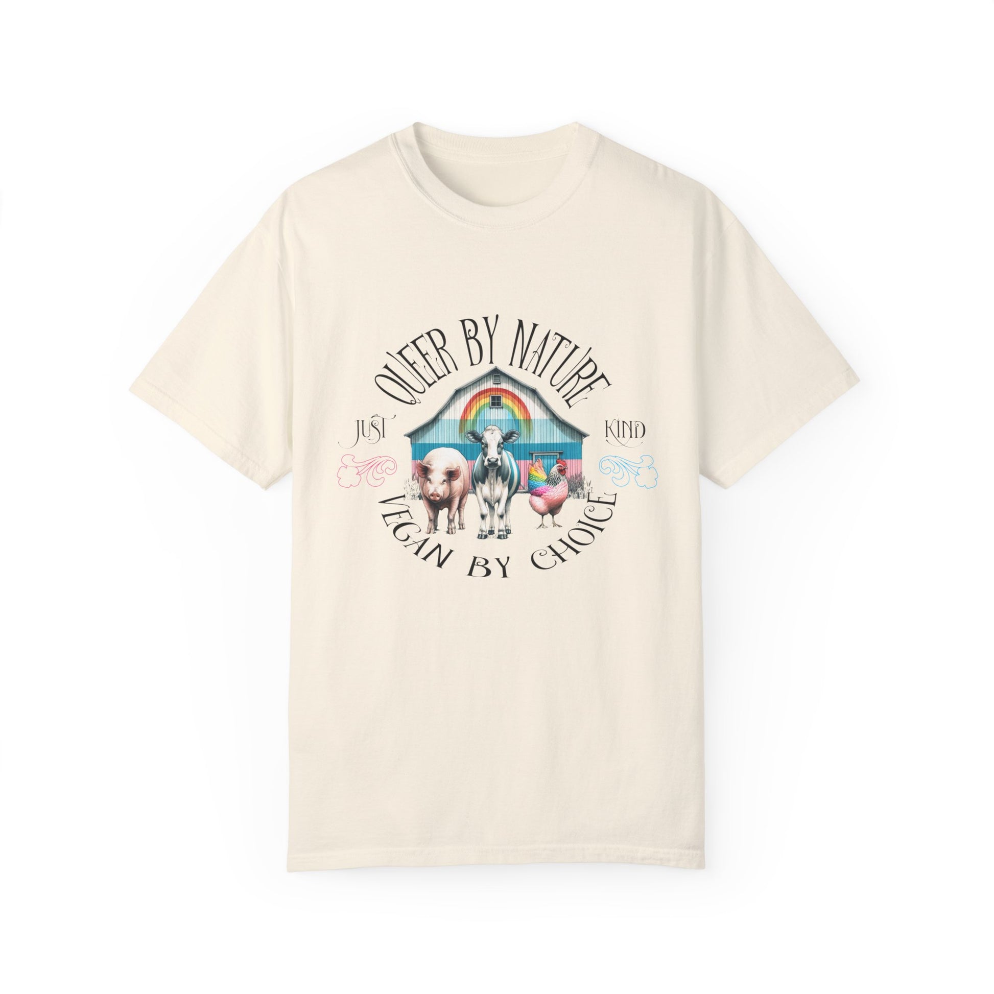 Celebrate your identity and lifestyle with our "Queer by Nature, Vegan by Choice" tee. This shirt features a vibrant design that proudly showcases your commitment to both the LGBTQ+ community and veganism. Made from soft, high-quality cotton, it offers comfort and style for everyday wear. Whether you're marching at a pride parade or enjoying a plant-based meal, this tee is perfect for expressing your values. Stand out with pride and compassion!