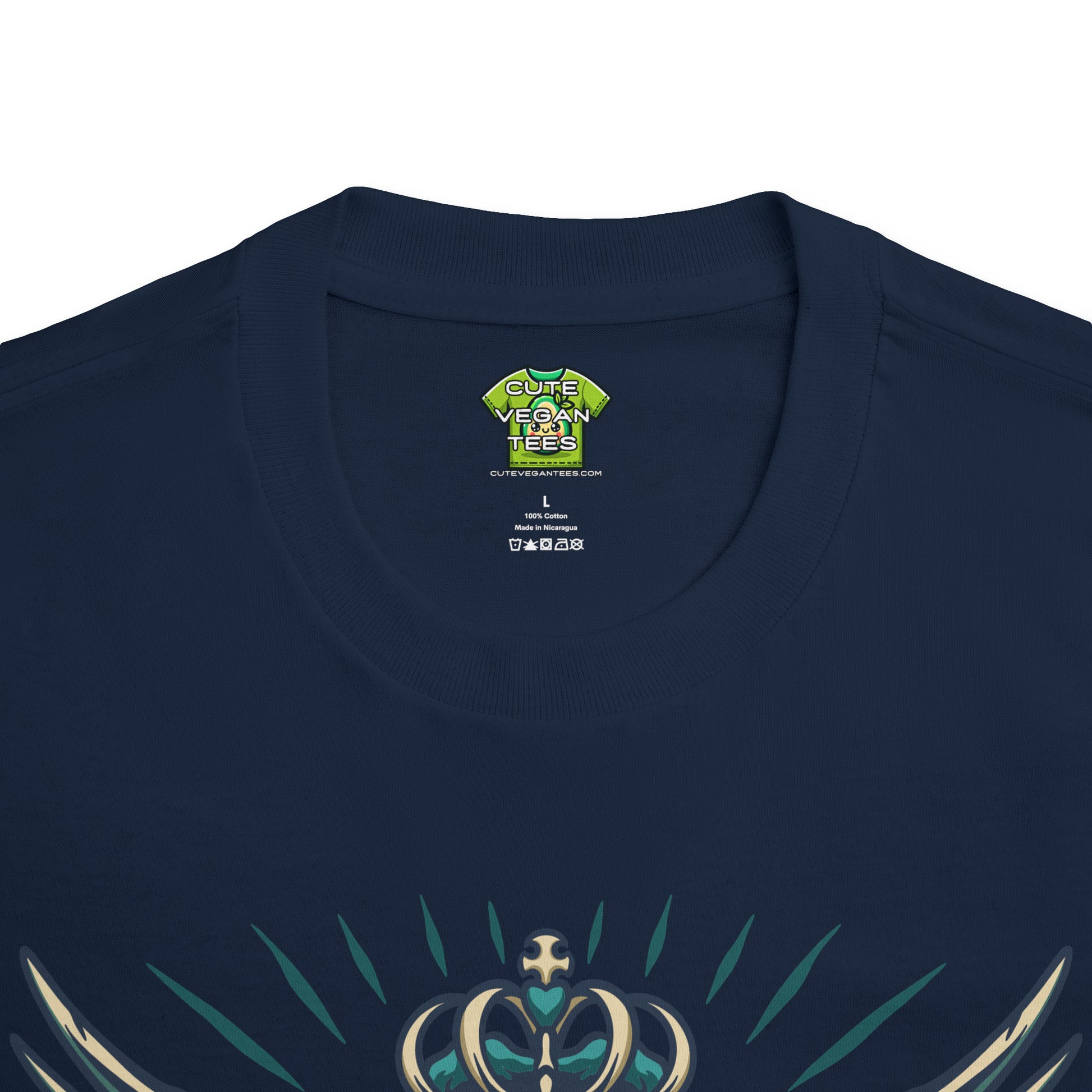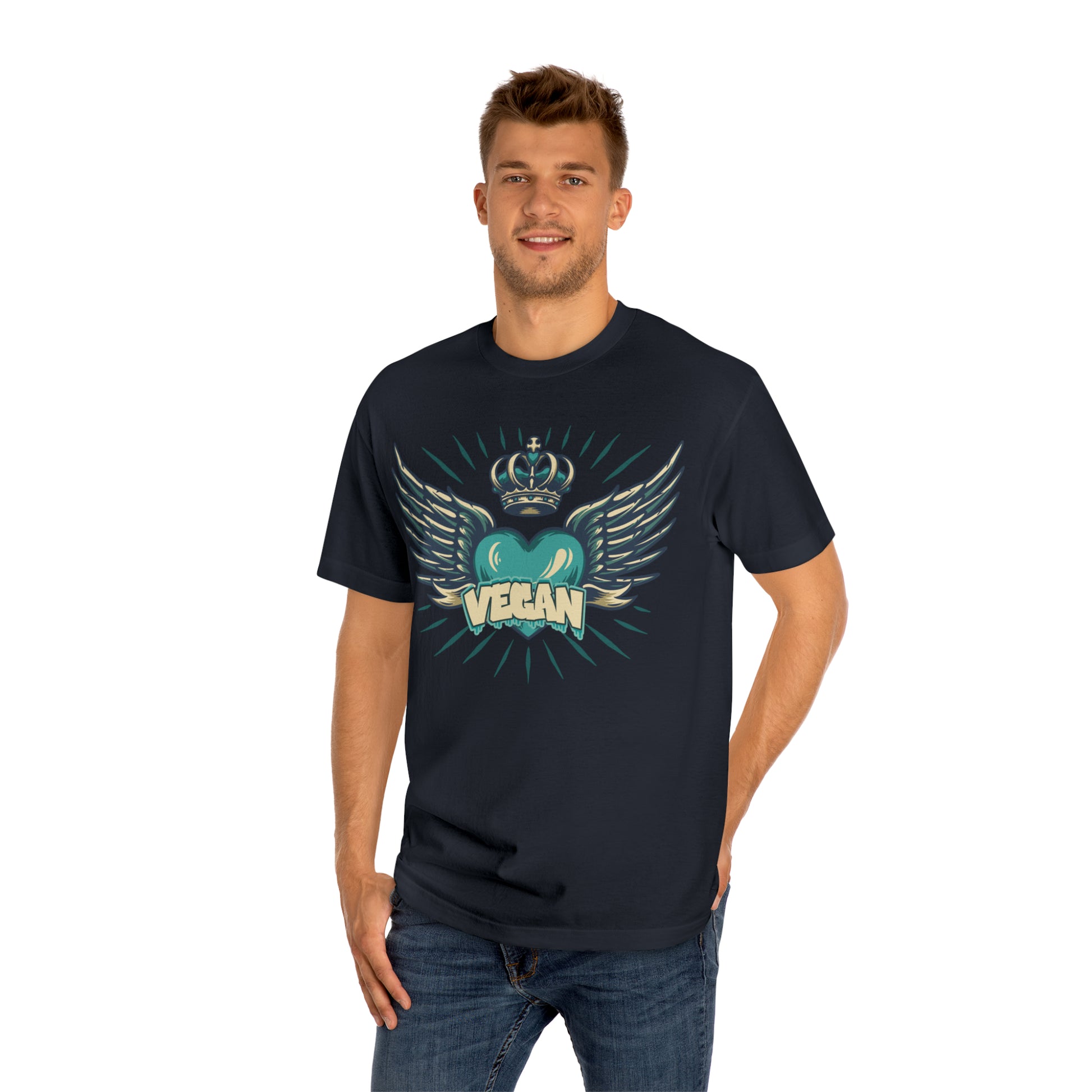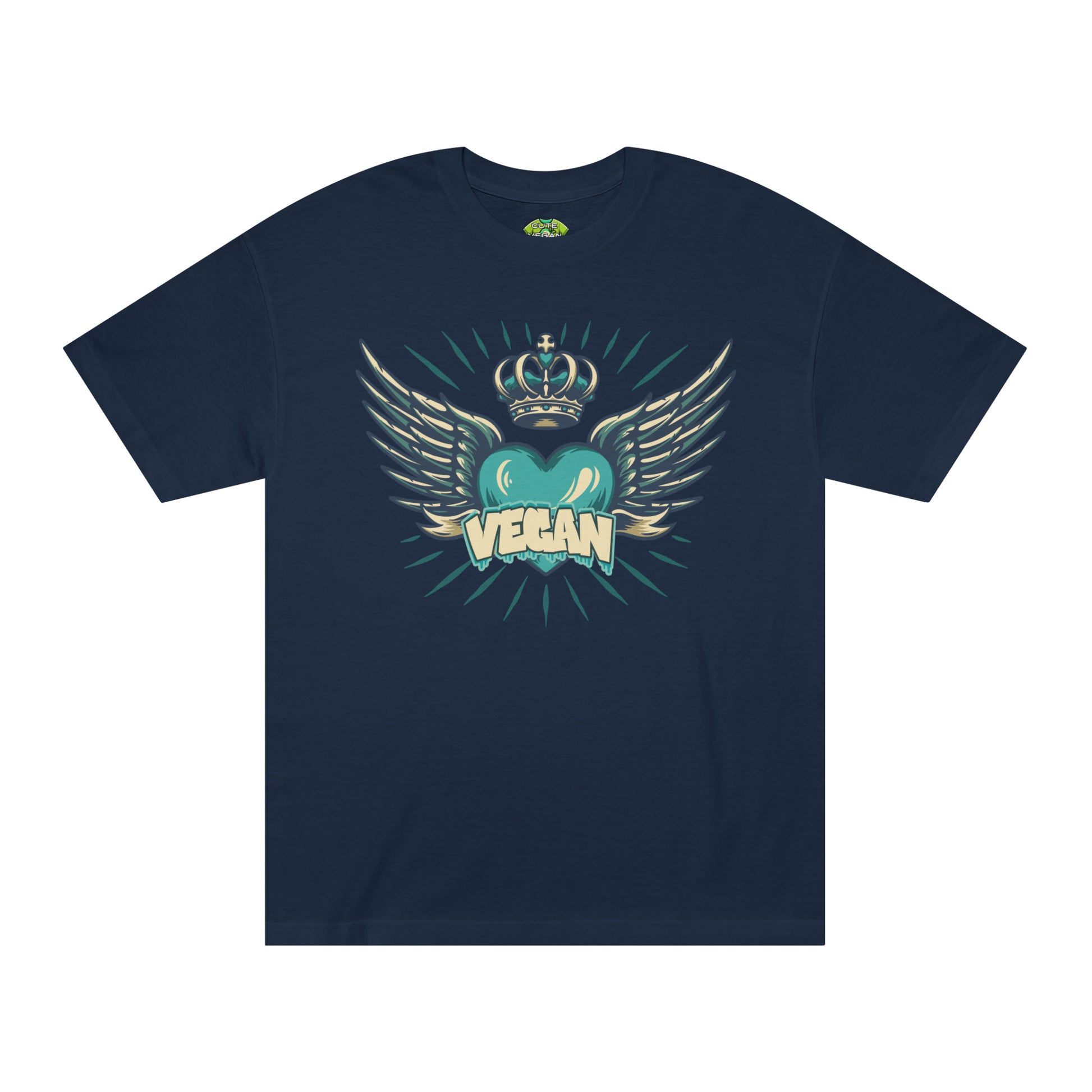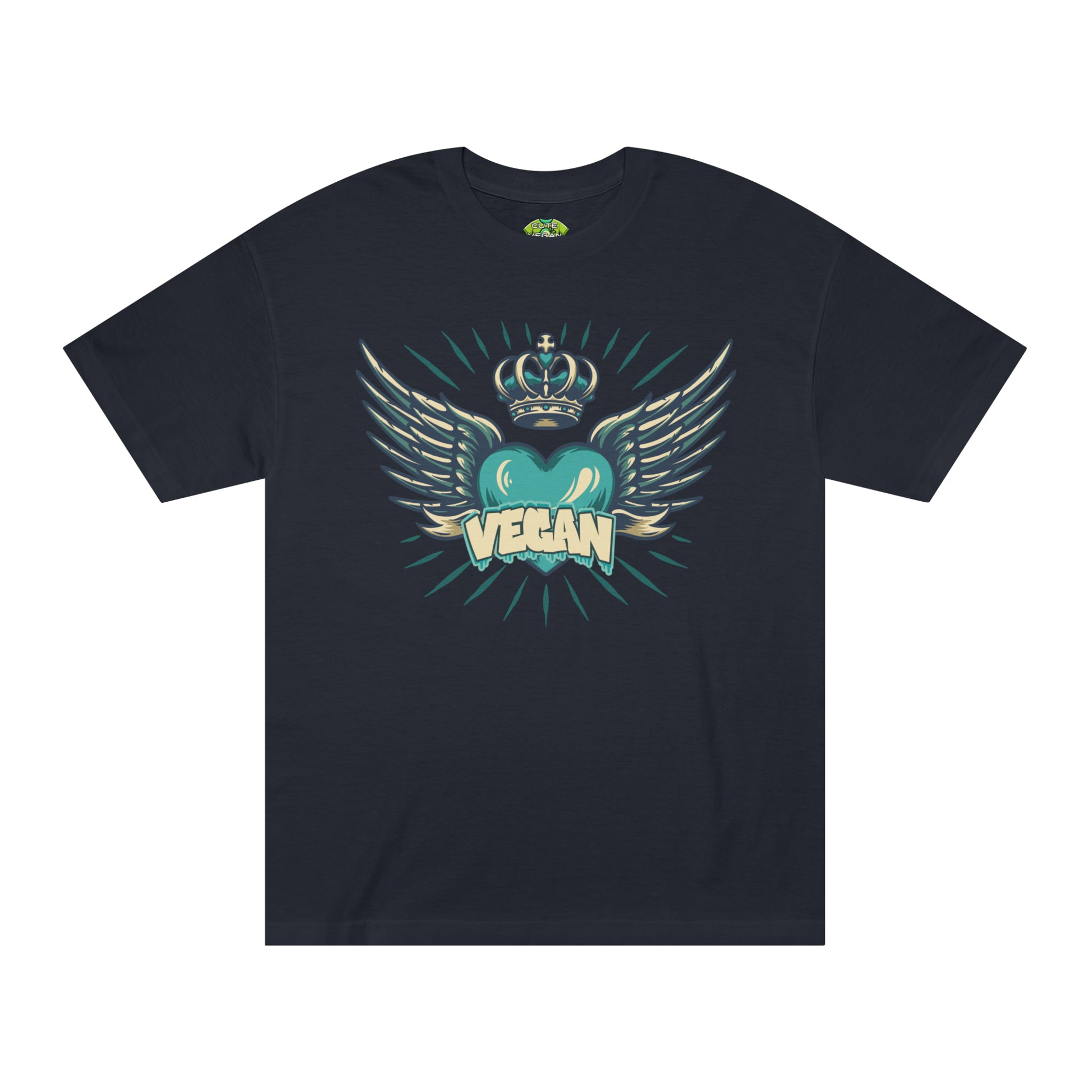 Show your grand vegan style and your kind message with our Royal Vegan Heart T-Shirt! Crafted from premium, heavyweight 6 oz cotton, this unisex tee ensures both comfort and durability. Featuring a striking navy or black backdrop {choose below!}, the design showcases a vibrant blue heart with wings and a crown, symbolizing compassion, freedom, and empowerment. Make a bold statement for veganism in style with Cute Vegan Tees, where fashion meets ethics seamlessly.