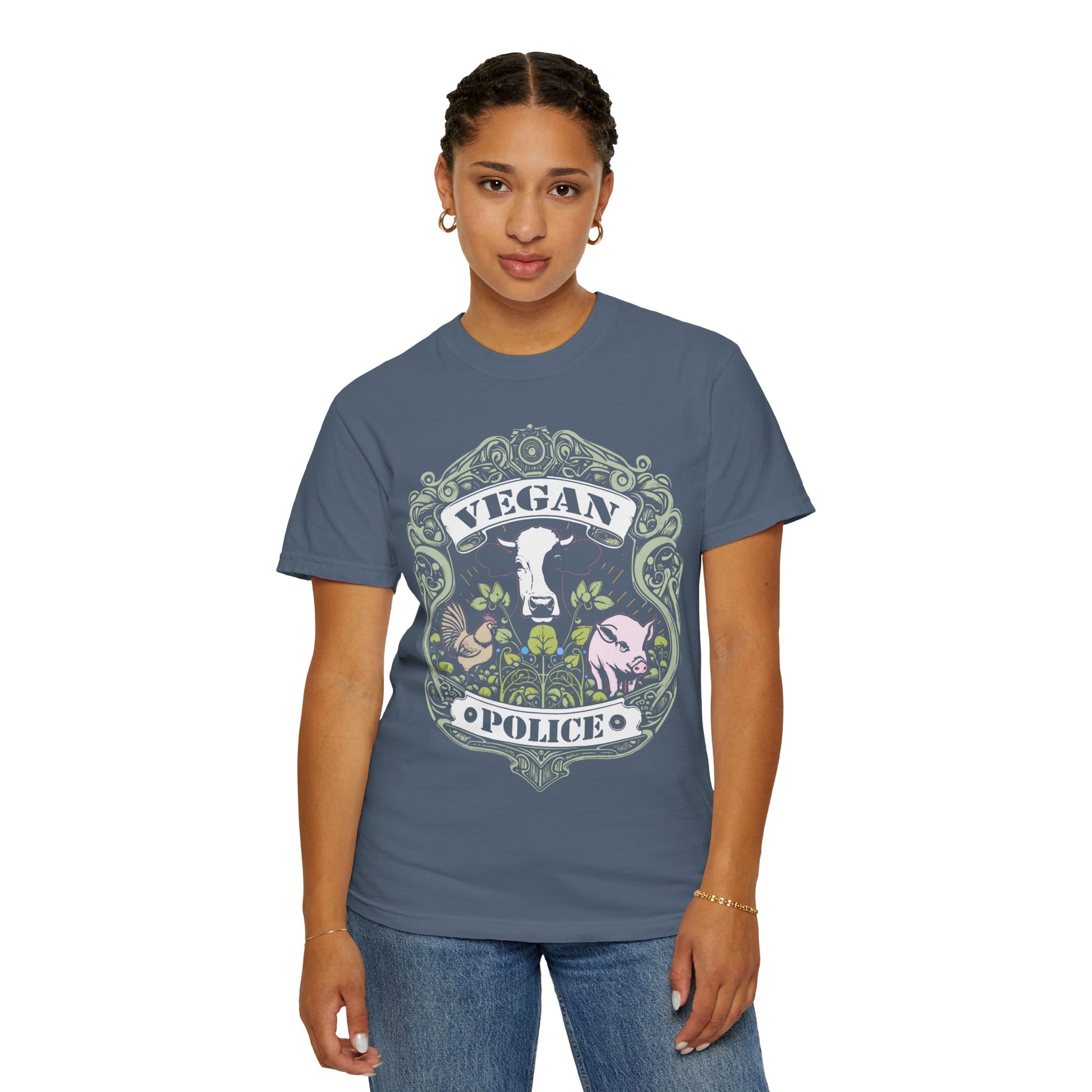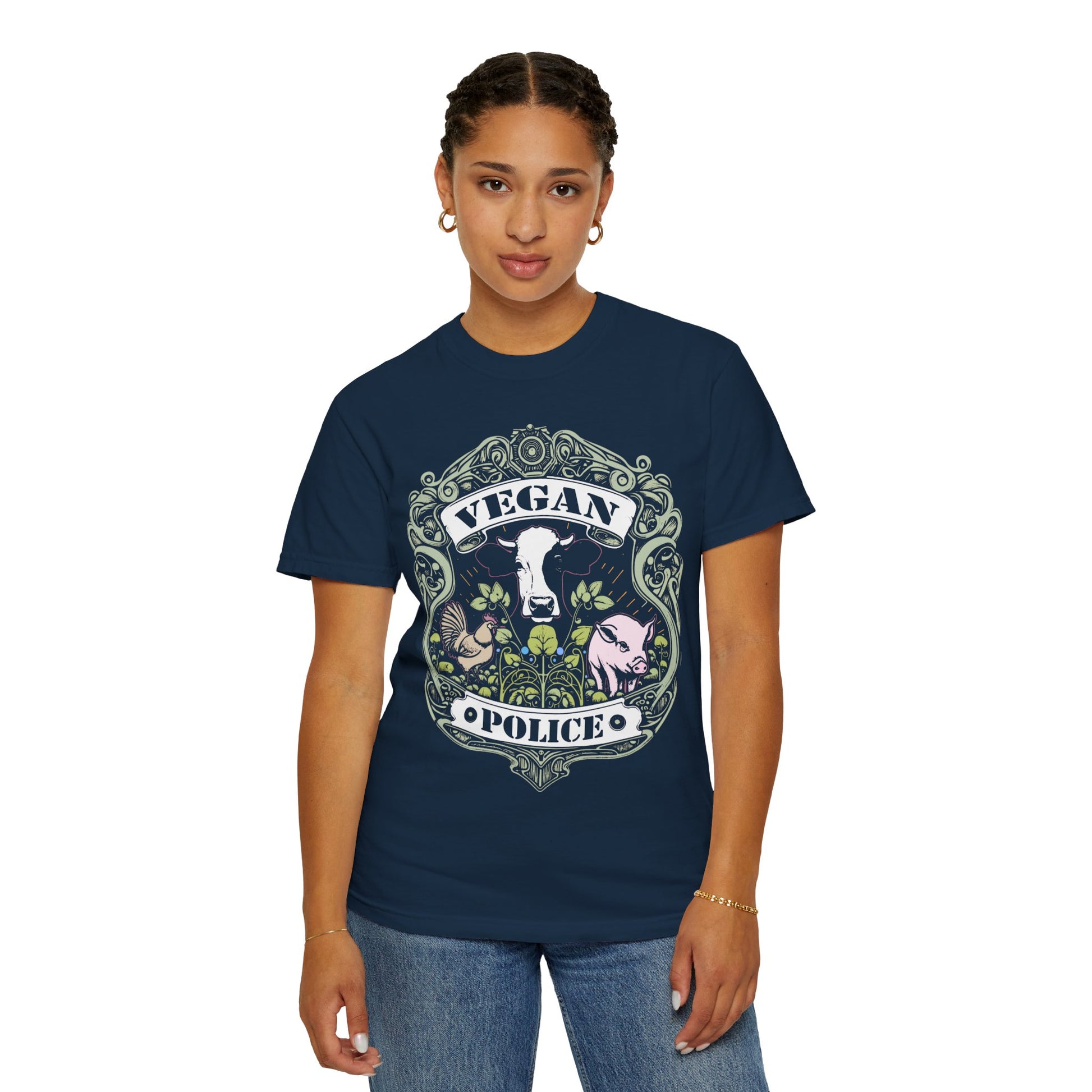 Enforce compassion, not cruelty with our "Vegan Police" Tee Shirt! This bold design features a cow, pig, and chicken, symbols of the animals we aim to protect. Available in darker hues, this tee exudes authority and commitment to ethical living. Crafted from high-quality vegan materials, it's not just a statement; it's a lifestyle. Wear it proudly to advocate for animal rights and spread awareness wherever you go. Join the force for kindness and make a fashion statement with purpose!