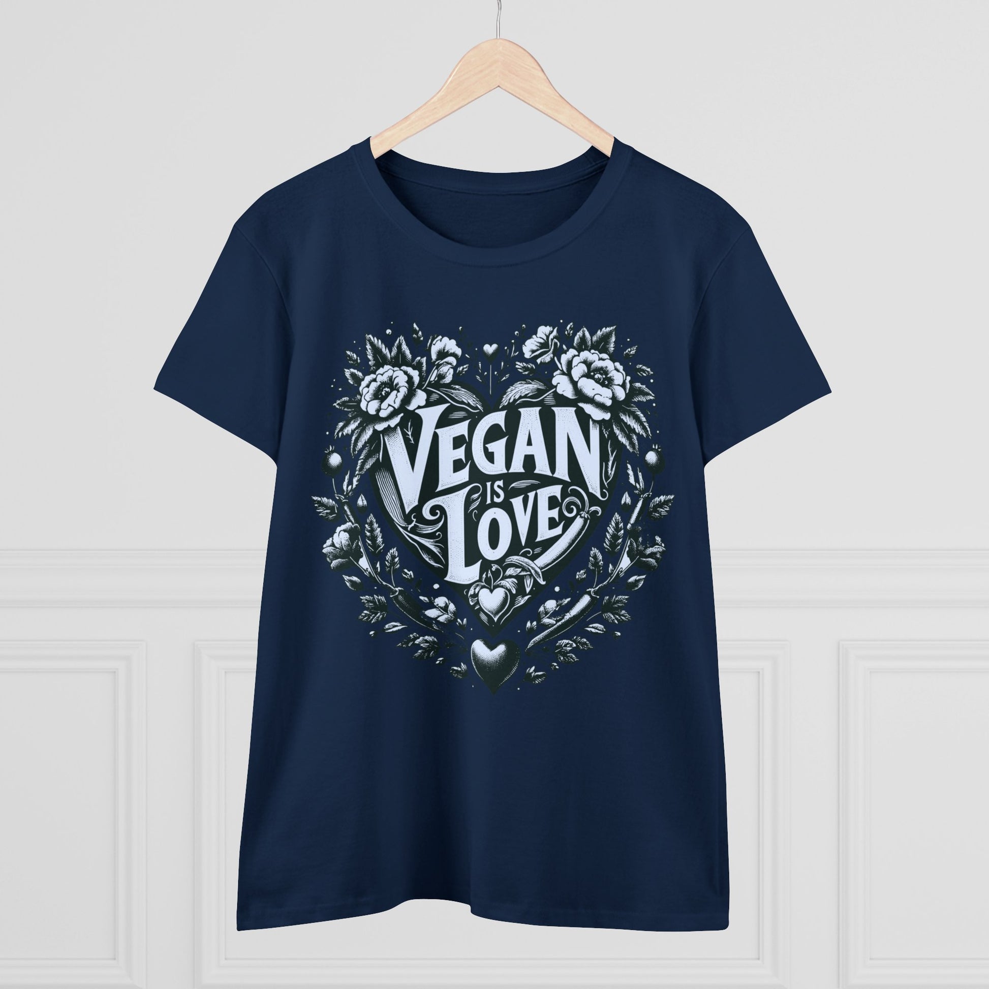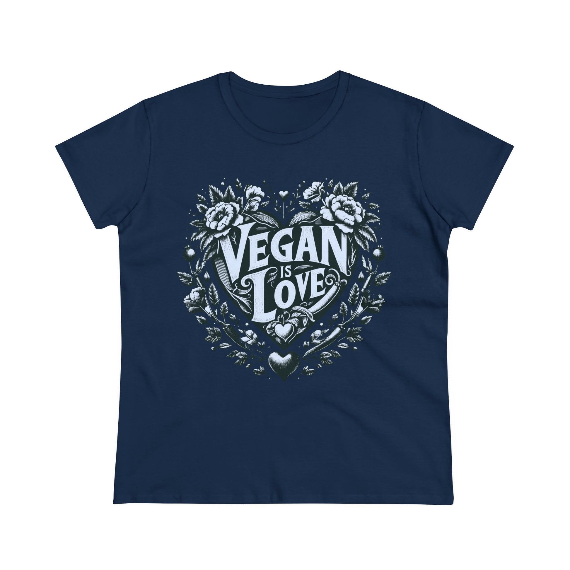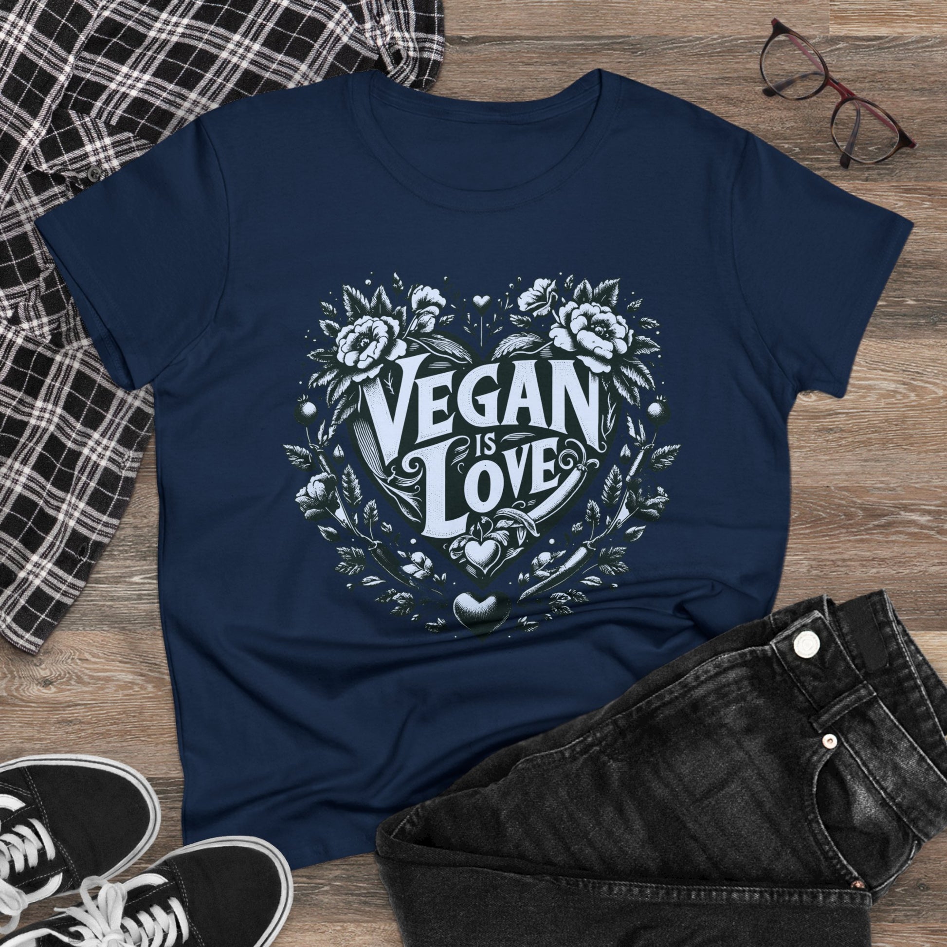 Spread love with our 'Vegan is Love' tee in a deep navy blue with a lighter blue design! Made with compassion from 100% vegan materials. Wear your heart on your sleeve and make a bold statement for kindness and ethical living. Let your fashion reflect your values with this eco-friendly and cruelty-free tee.