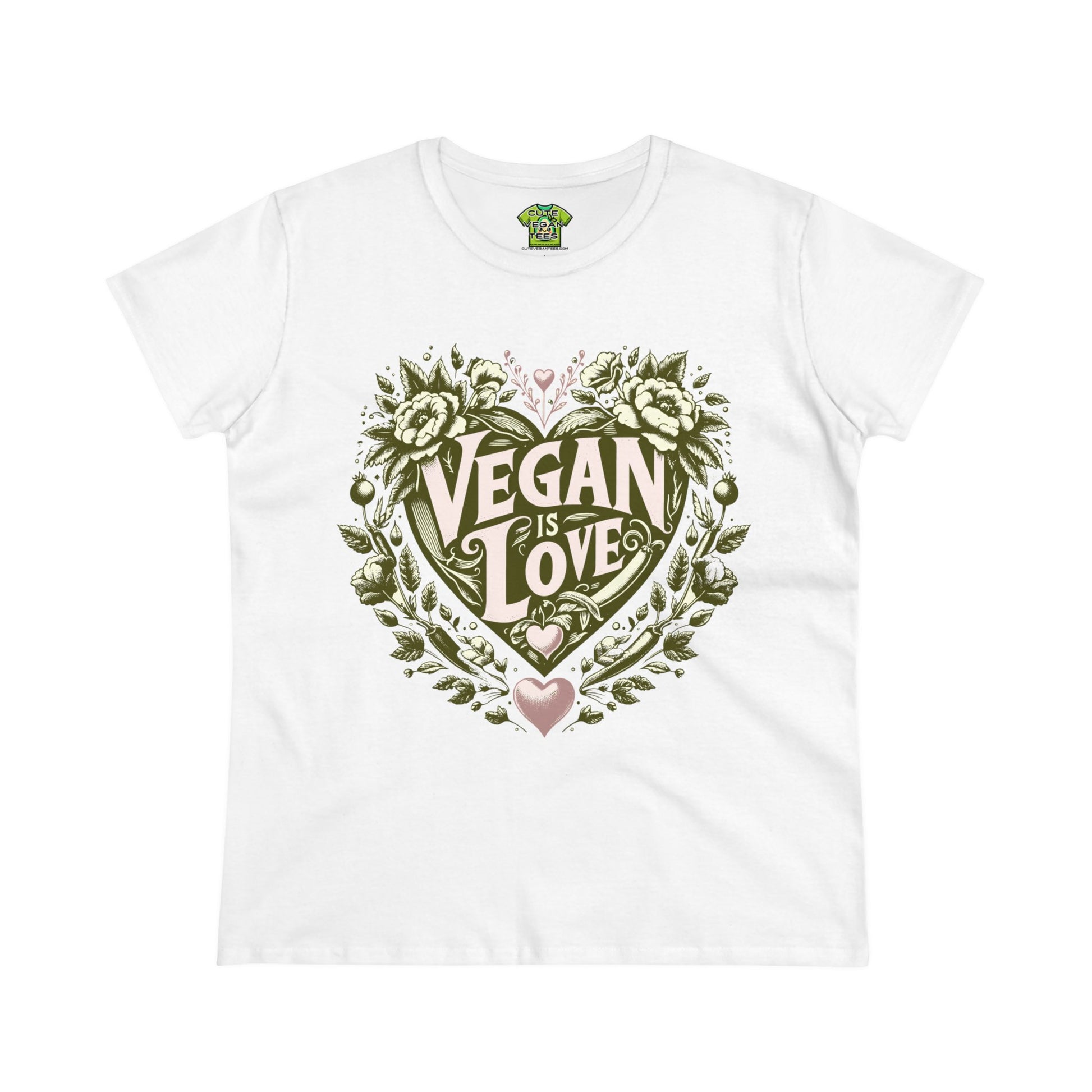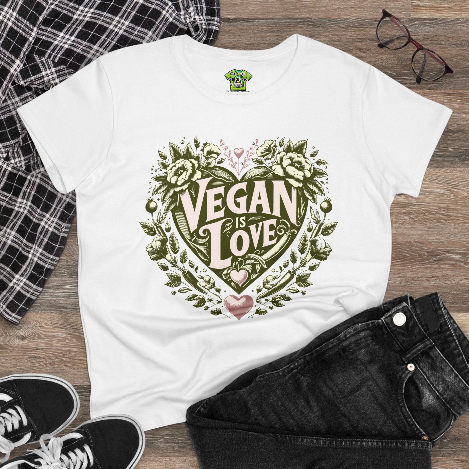 Spread love with our 'Vegan is Love' tee in white with a light green and pink design! Made with compassion from 100% vegan materials. Wear your heart on your sleeve and make a bold statement for kindness and ethical living. Let your fashion reflect your values with this eco-friendly and cruelty-free tee.