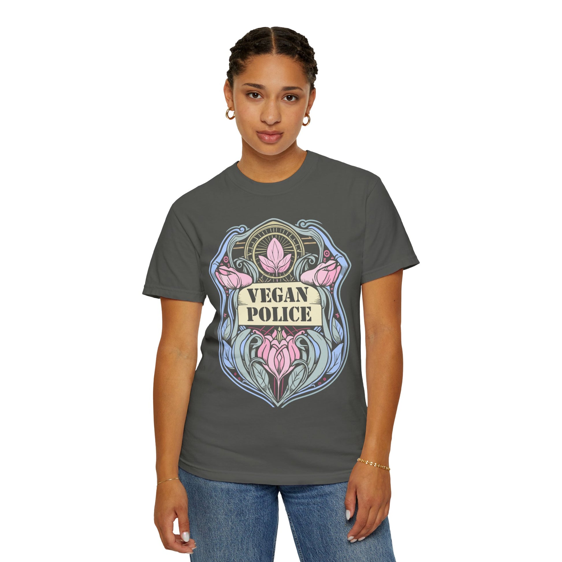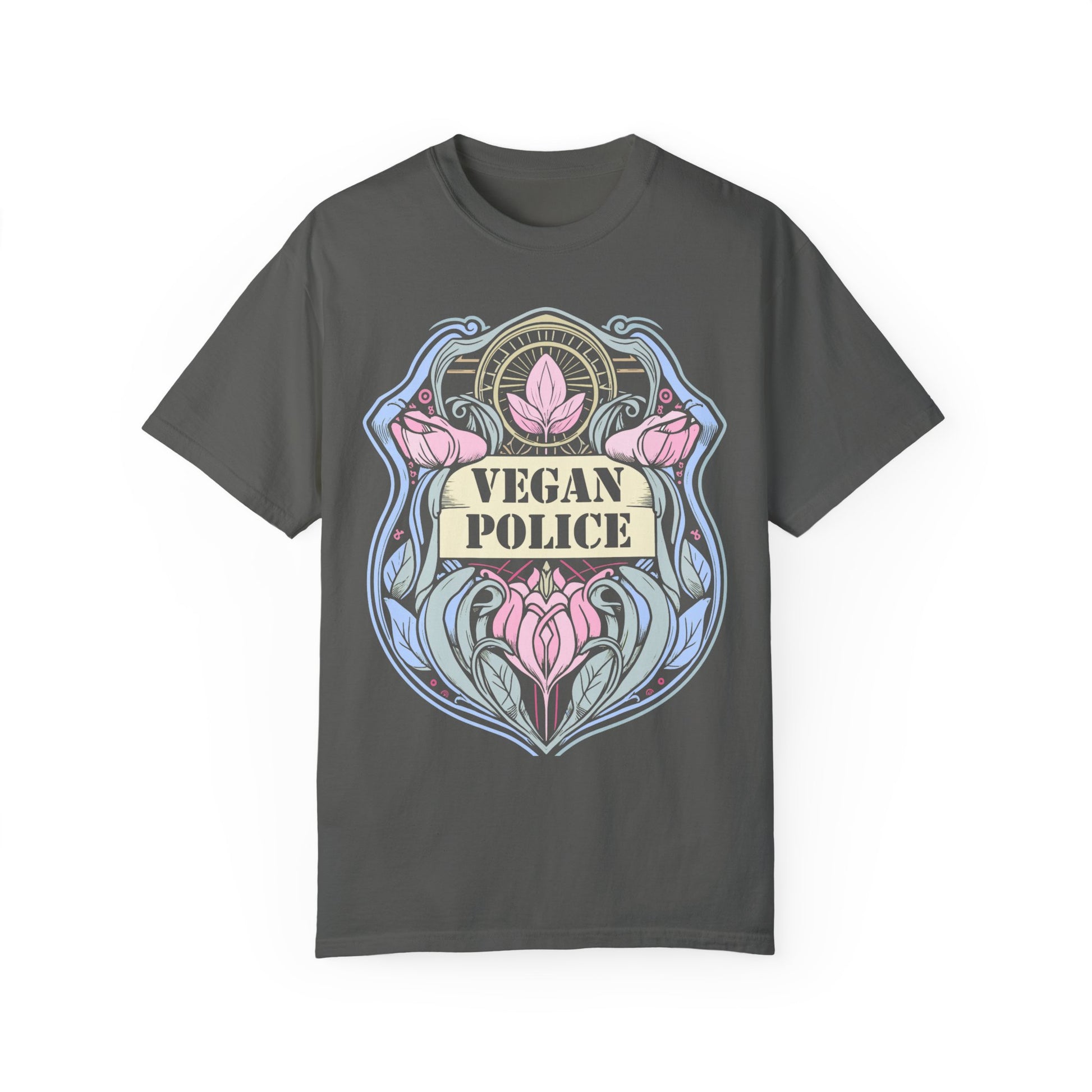 Introducing our "Vegan Police" badge tee, a playful yet powerful statement for the ethical enforcers among us! This unique design features bold lettering on a badge-shaped background, set against blue and green-hued tees for a striking visual impact. Crafted with comfort and sustainability in mind, it's perfect for showcasing your commitment to a cruelty-free lifestyle. Whether you're patrolling for plant-based goodness or just rocking your vegan pride, this tee is sure to turn heads. Join the force for compassion and shop now!