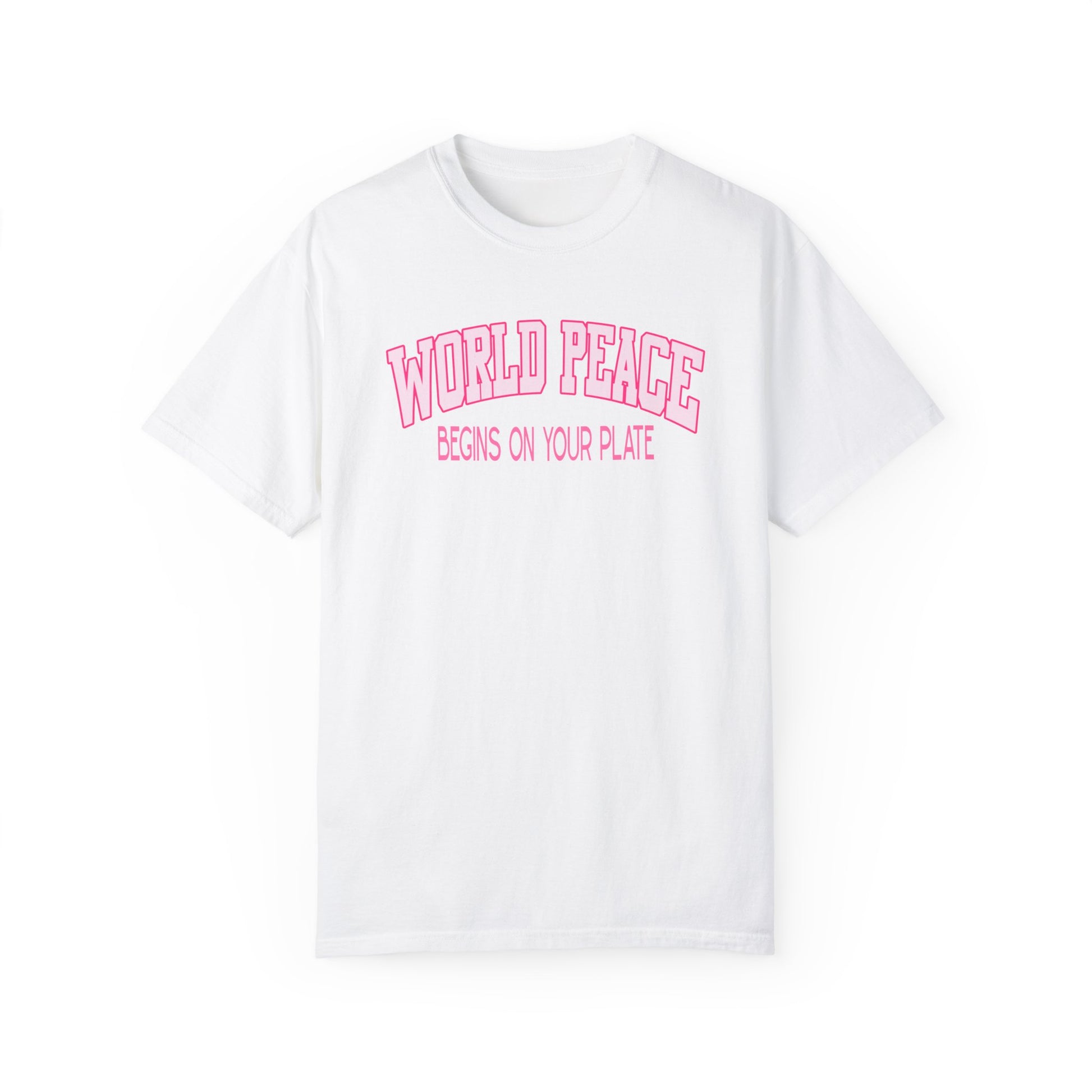 Spread the message of peace with our "World Peace Begins On Your Plate" vegan tee shirt from Cute Vegan Tees. Crafted from eco-friendly materials, this shirt features a stylish design that promotes kindness to all beings. Perfect for vegans and advocates of a cruelty-free lifestyle, it's not just a garment, but a statement. Wear it proudly and spark conversations about the power of compassion. Get yours today and be a part of the movement towards a more peaceful world.